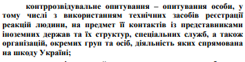 В положение о праве проведения контрразведывательного опроса авторы проекта заложили норму, что опрос лица допустим в том числе с использованием технических средств регистрации реакций человека, на предмет его контактов с представителями иностранных государств и их структур, специальных служб, а также организаций, отдельных групп и лиц, деятельность которых направлена на ущерб Украине.
