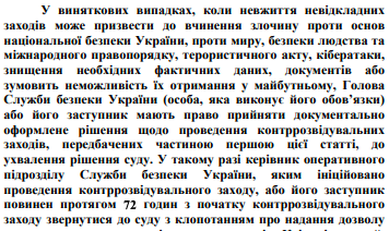 Правда, по проекту звучит оговорка "в исключительных случаях" (но трактовать, естественно, эти случаи при желании можно очень широко). При этом СБУ должно будет в течение 72 часов обратиться в суд, чтобы получить разрешение постфактум.