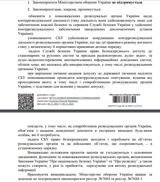 Прямо выступило против норм этого законопроекта, которые расширяют полномочия СБУ над разведкой, а также дают беспрепятственный доступ сотрудникам Службы на охраняемые военные объекты, и Минобороны Украины.