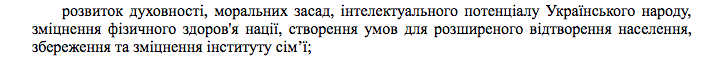 Раньше приоритетом национальных интересов среди прочих было развитие духовности, моральных основ, интеллектуального потенциала украинского народа, укрепление физического здоровья нации, создание условий для сохранения и укрепления институтов семьи, создание условий для полноценной жизни ребенка, безопасности, благополучия, развития ребенка в благополучной атмосфере.