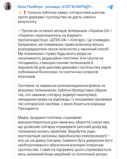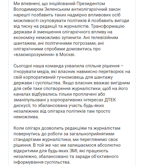 "Сначала "слуги народа" потихоньку бойкотировали наш телеканал. Сперва они отказывались от отдельных тем – например, на тему тарифов они не хотели ходить, а хотели ходить на тему диджитализации. Потом отказались вовсе. Причём в частной беседе многие из них говорили, что, мол, уважительно относятся к журналистам и готовы прийти, но им запрещает пресс-служба. Дальше они отказались ходить на телеканал "Прямой", теперь и на каналы группы "Украина".