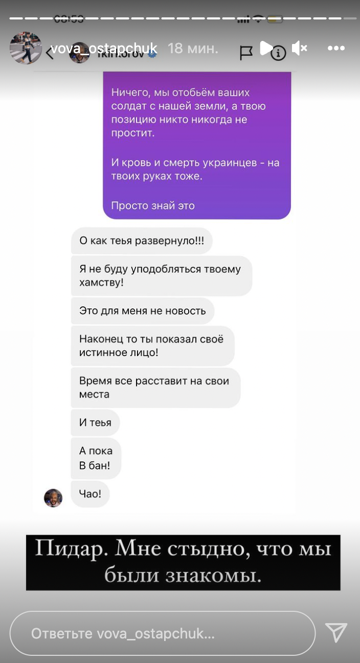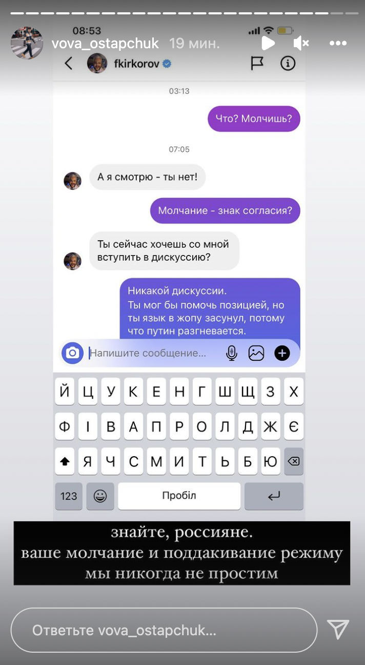 Звезда российской эстрады Филлип Киркоров публично не высказывался о войне между Украиной и Россией. За это в личной переписке его пристыдил украинский телеведущий Владимир Остапчук. В InstaStories телеведущий показал переписку с Киркоровым.