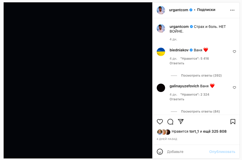 Однако посты с такой же картинкой выставляют те звезды, которые считают, что Путин "освобождает Украину" и оправдывают его действия. В то же время несколько дней певец никак не высказывался о войне - ни за, ни против.