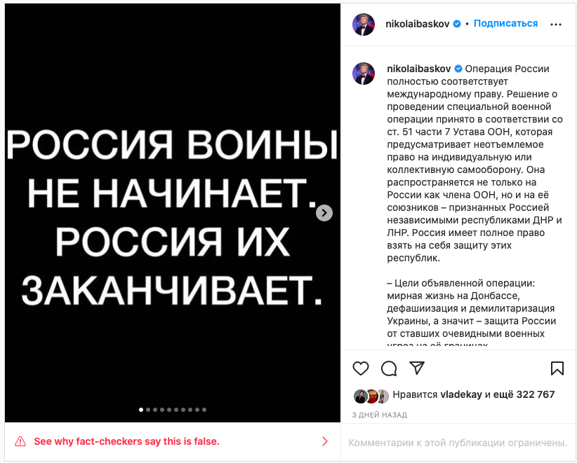 Несколько дней подряд украинцы массово жаловались на эту публикацию, и в данный момент Инстаграм маркирует его как "ложную информацию". Но этот пост все еще можно посмотреть на его странице.