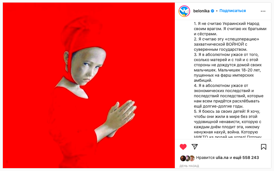 "Я вас очень прошу, те, кто может остановить этот ужас. Ведь мы все маленькие люди, мы ничего не можем, но есть люди, которые вершат судьбы и которые могут сделать все, чтобы весь этот ад закончился. Это глобальная катастрофа для всего мира, и к чему мы придем, непонятно. Наша жизнь на волоске, жизнь всех нас на волоске, а Украина с каждой секундой теряет людей. Но мы же все хотим мира, люди на планете хотим мира. Среди моих подписчиков 10 миллионов россиян. Я вас очень прошу, я умоляю — давайте все остановимся", — сказала артистка.