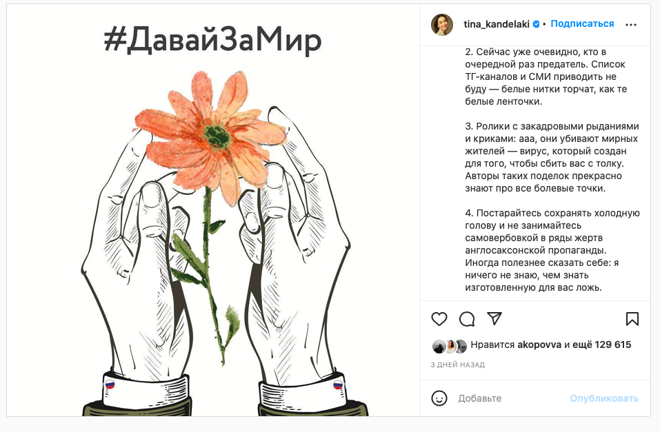 Часть российских селебрити открыто поддерживают и оправдывают вторжение России в Украину. В своих публикациях они в основном используют хештег #ДавайЗаМир.