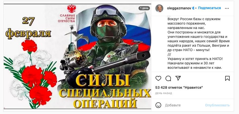 Российский певец Олег Газманов выложил поздравительную открытку, где 27 февраля называется днем "сил специальных операций". Артист также оправдывает действия Путина тем, что "в Украине у власти нацисты", Украину накачало оружием НАТО, а "сегодня именно Россия взяла на себя ответственность и малым сражением предотвратила большую войну в мире". Тезисы очень схожи с теми, которые озвучил Николай Басков.