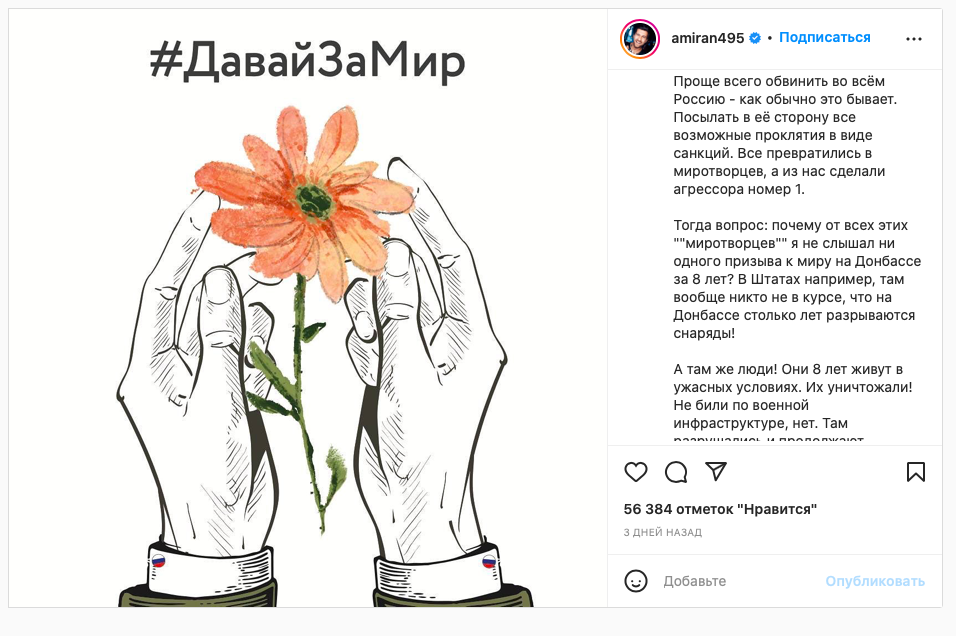 Популярный блогер Амиран Сардаров, который недавно вернулся в Россию после неудачной эмиграции в США, выложил то же фото, что и Тина Канделаки с хештегом #ДавайЗаМир. И четко озвучил тезисы в поддержку Путина.