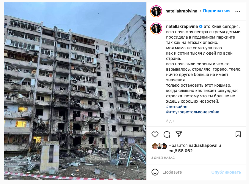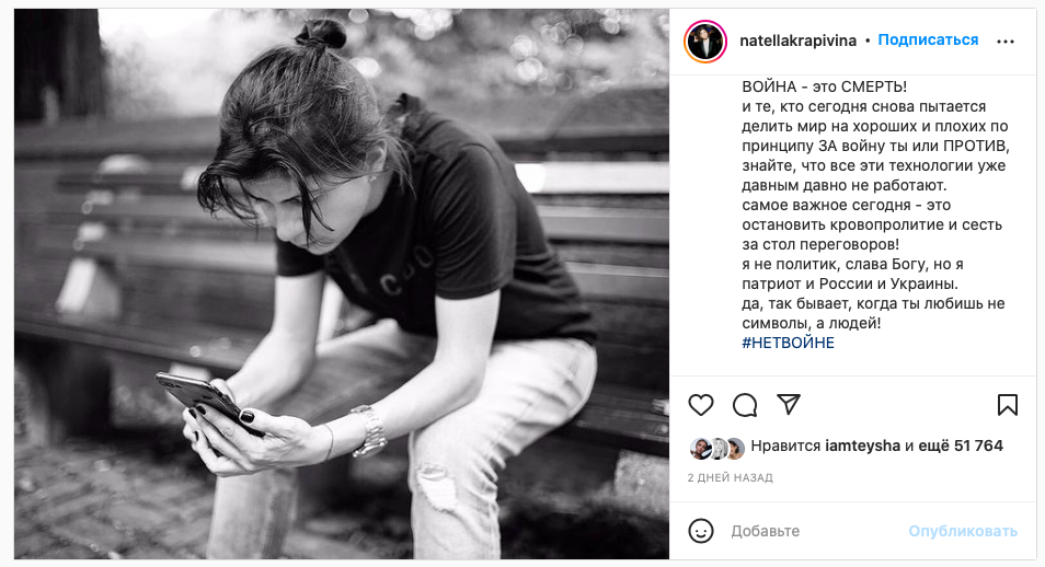 Продюсер Нателла Крапивина также осудила действия России в отношении Украины под хештегом #нетвойне.