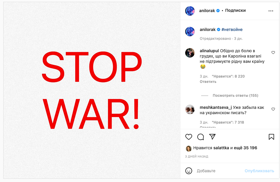Украинская певица Ани Лорак, которая после начала войны на Донбассе переехала в Россию, ограничилась картинкой с призывом остановить войну и хештегом #нетвойне. С тех пор она хранит молчание в соцсетях и подробно свое мнение о происходящем не выражает.