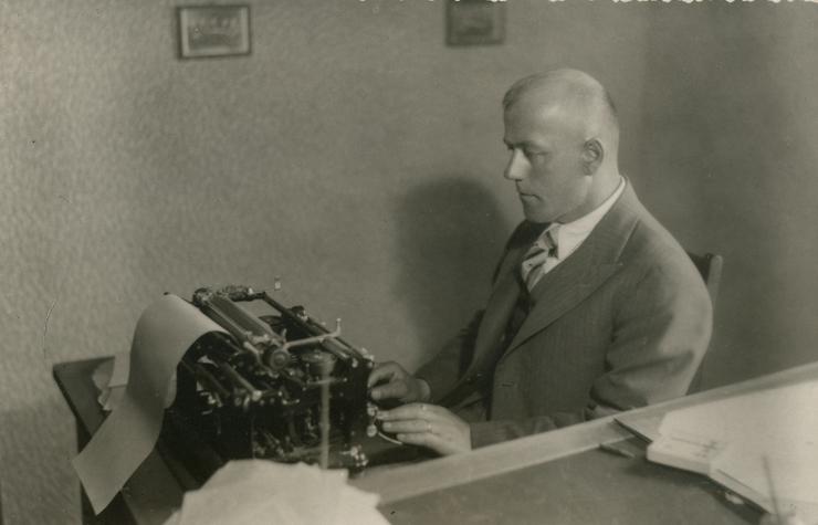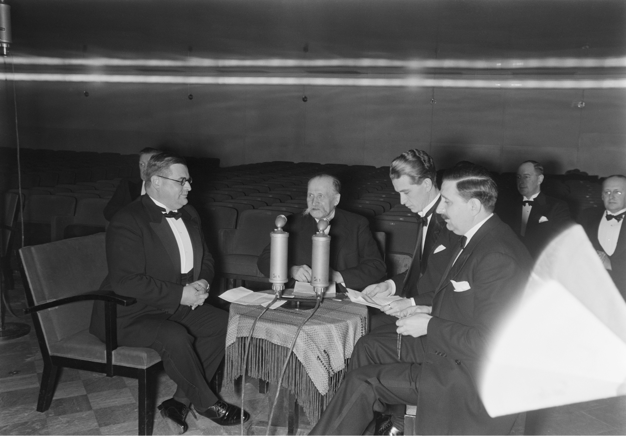 Министр иностранных дел Эркко (в кресле и в очках) и президент Финляндии Каллио (за микрофонами с длинными усами). 1939 год