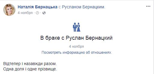 Для Руслана этого уже второй брак. Он был женат на дизайнере Елене Бернацкой, от этого брака есть дочь. А 31-летней Наталье Севостьяновой ранее приписывали роман с ее начальником - министром Петренко, с которым она работает вот уже почти три года. Однако, вскоре стало известно, что она встречается с Бернацким, когда она сама в социальные сети начала выкладывать совместные снимки.
