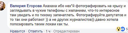 "Ахахахаха, ибо нех*й фотографировать на крысу и заглядывать в чужие телефоны с желанием, что-то интересное там увидеть и по тихому запечатлеть. Фотографируйте депутатов и то как они работают. А не других журналистов. Давно хотела попозировать таким лохам как ты", – написала Егорова.