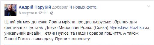 Дочь спикера даже сшила ради фестиваля наряд в древнерусском стиле. По словам Андрея Парубия, она год мечтала о таком платье. Всех мастериц, которые его создавали, Парубий поблагодарил у себя на страничке в соцсети.
