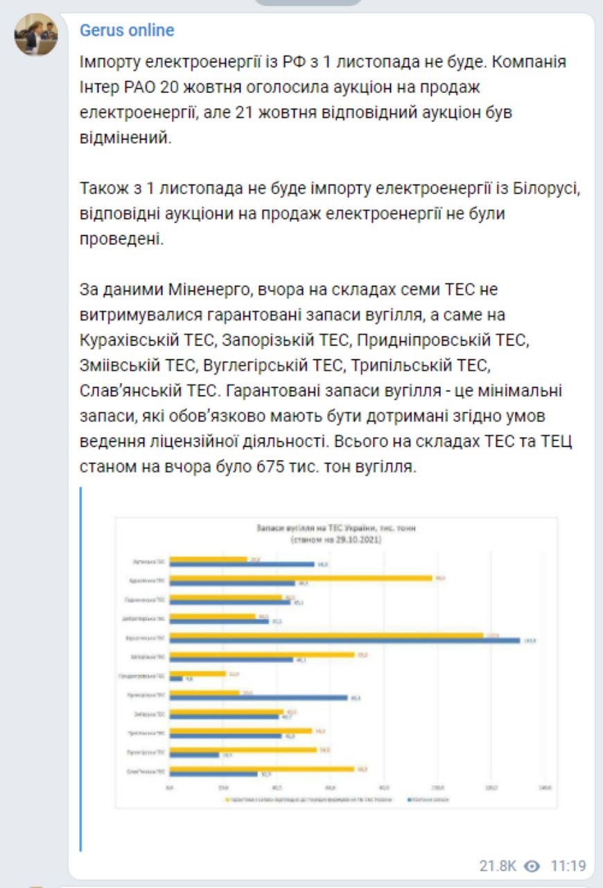 Герус добавил, что по данным Минэнерго, состоянием на 29 октября на складах семи тепловых электростанций не соблюдались нормы гарантированных запасов угля. Таким образом нарушения зафиксировали на нескольких электростанциях: Кураховской ТЭС, Запорожской ТЭС, Приднепровской ТЭС, Змиевской ТЭС, Углегорской ТЭС, Трипольской ТЭС и Славянской ТЭС.