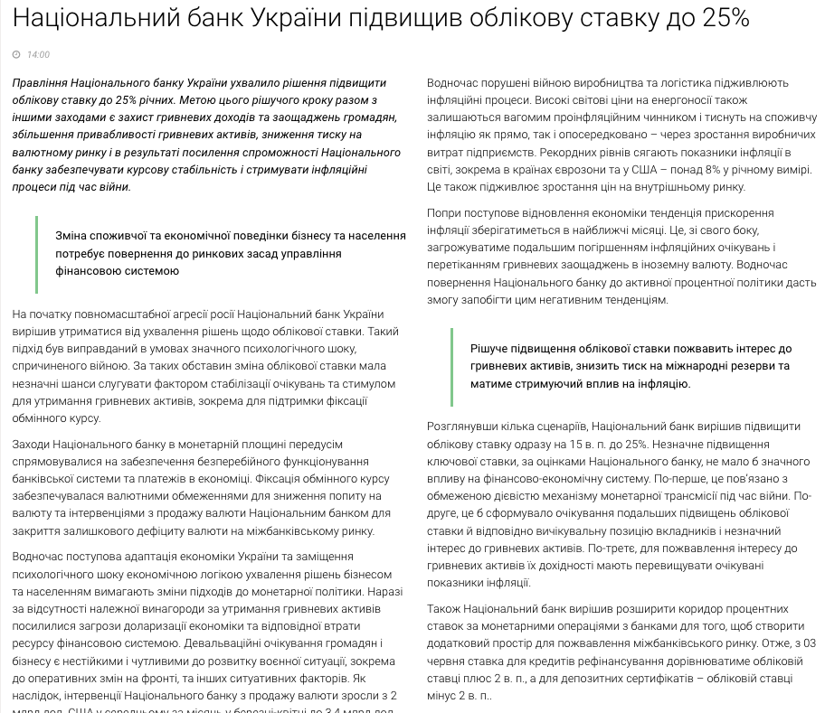 В НБУ говорят, что в начале войны решили не менять учетную ставку, чтобы избежать паники и поддержать фиксацию обменного курса.