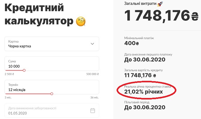 При льготной ставке в 1,6% Моно официально подтверждал реальную годовую кредитную ставку по своей черной карте на уровне 21,02% годовых. При кредитном лимите на уровне 10 тыс. грн и минимальном платеже 400 грн/месяц до 30 июля человек должен был переплатить 1,7 тыс. грн.