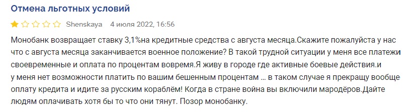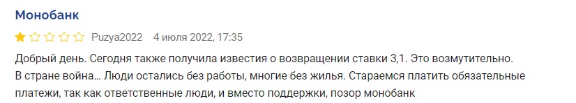 Люди крайне негативно отреагировали на возврат Монобанка к довоенным (стандартным) тарифам и открыто заявляют об этом в отзывах на финансовых ресурсах. Украинцы жалуются на нежелание кредитора вникать в текущие военные трудности населения.