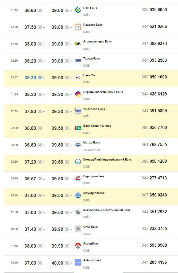 • 37,50-38,50 грн/$ - Приватбанк;