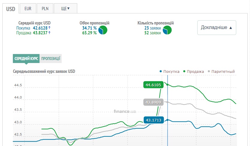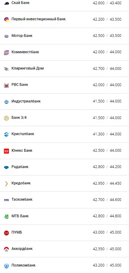 Больше дюжины финучреждений держали расценки в диапазоне 44,0-44,80 грн/$: ТАСкомбанк, Кредобанк, Коминвестбанк, Индустриалбанк, МТБ Банк, Юнекс Банк и др.