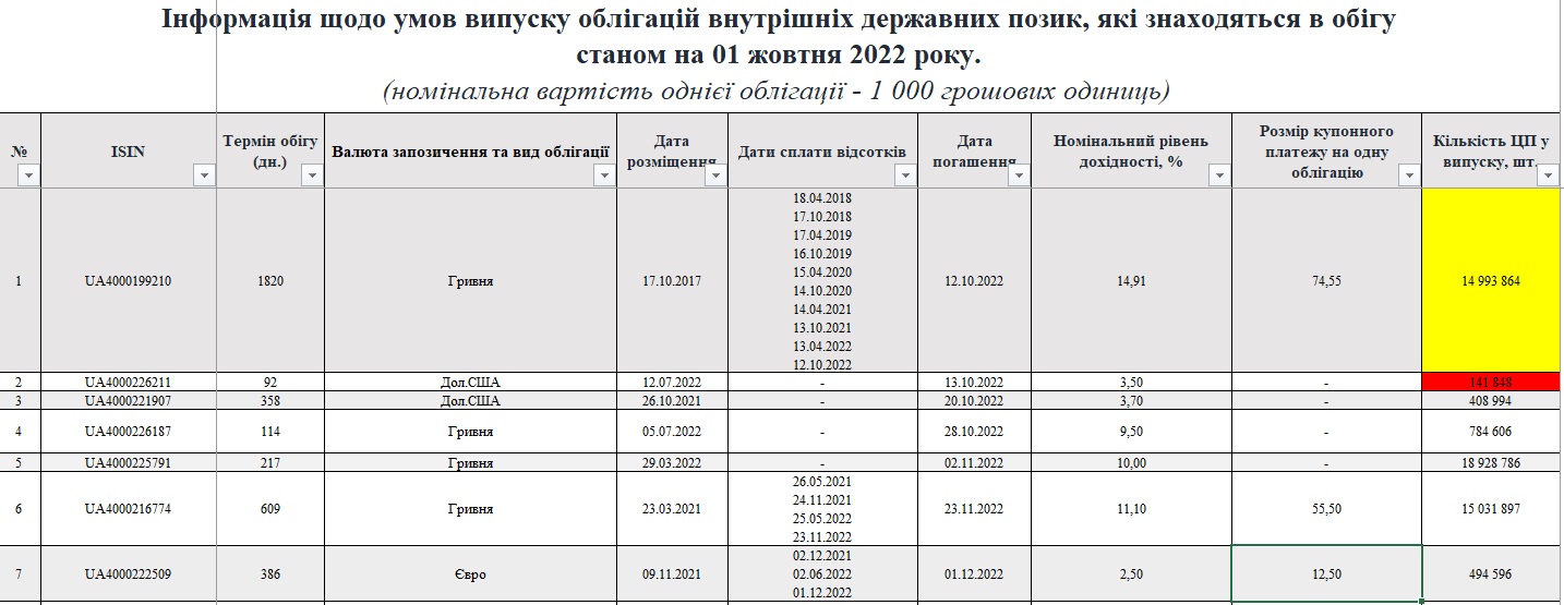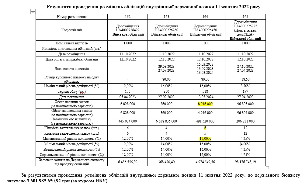 Сегодня, 11 октября, Министерство финансов смогло разместить военных облигаций на общую сумму 3,6 млрд грн, что подтверждается его собственным отчетом.