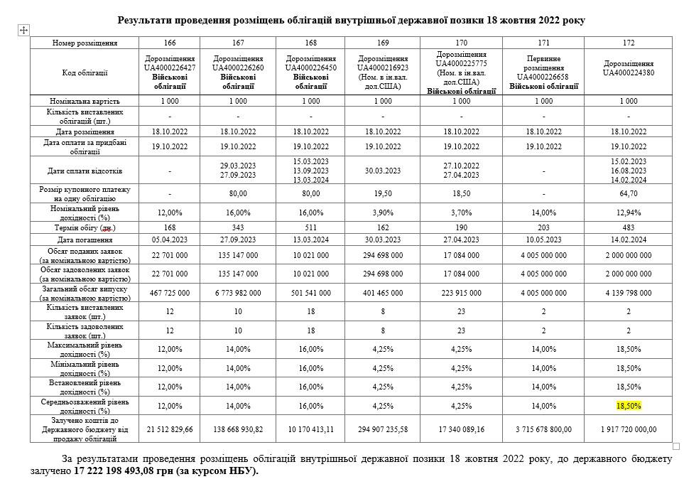 Ставку 18,5% годовых получили 1,5-летние ОВГЗ (погашение в феврале 2024 года), которых сегодня продали на 1,9 млрд грн. Бумаги реализовывались в рамках дополнительного размещения к выпуску января 2022 года, которые изначально продавались под 12,94%. Выходит, что ставка подскочила с 12,94% до 18,5%. Источники "Страны" сообщили, что эти 18,5% годовых получило два госбанка - Приватбанк и Ощадбанк и поднятие ставки лично "пробивал" глава НБУ Пышный.