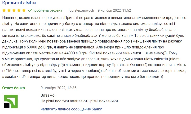 В Монобанке (Универсалбанк) заемщикам также не конкретизируют причины, по которым решили отказать в предоставлении кредитного лимита по карте. Просто говорят об анализе информации о человеке и все, хотя надежду на восстановление лимита в будущем все-таки оставляют. Но без какой-либо конкретики.
