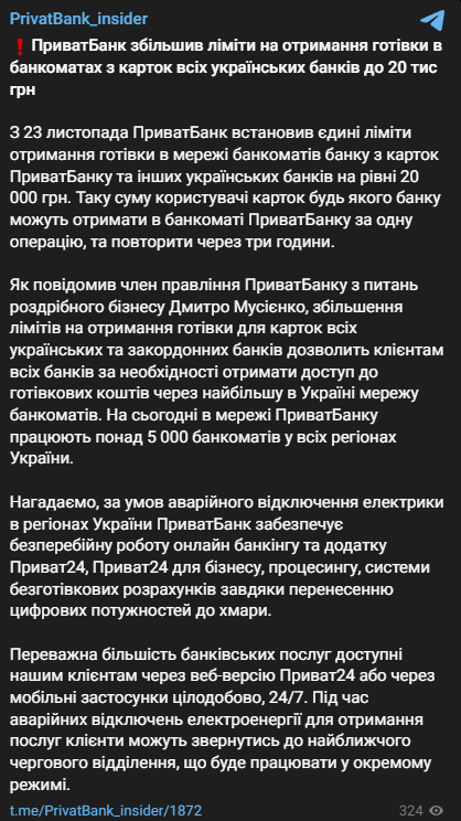 "Увеличение лимитов на обналичивание карт всех украинских и зарубежных банков позволит клиентам всех банков при необходимости получить доступ к наличным средствам", – сообщил член правления ПриватБанка по вопросам розничного бизнеса Дмитрий Мусиенко, которого процитировала пресс-служба.