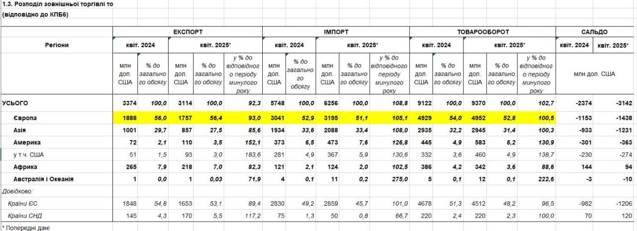 Отчетности о валютной структуре контрактов за этот год еще нет, но известно, что в апреле в Европу уходило 56,4% украинского экспорта (против 56,0% за аналогичный период 2024-го) и на ЕС приходилось 51,1% всего импорта. Валюта контрактов при этом не указывается.