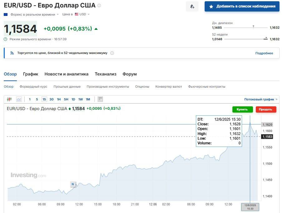 Подорожание евро в Украине напрямую связано с курсовыми скачками в паре евро/доллар на мировом рынке. Сегодняшний пик составил 1,1632, и его НБУ еще не учел в своем официальном курсе, иначе тот достиг бы 48,3 грн/€.