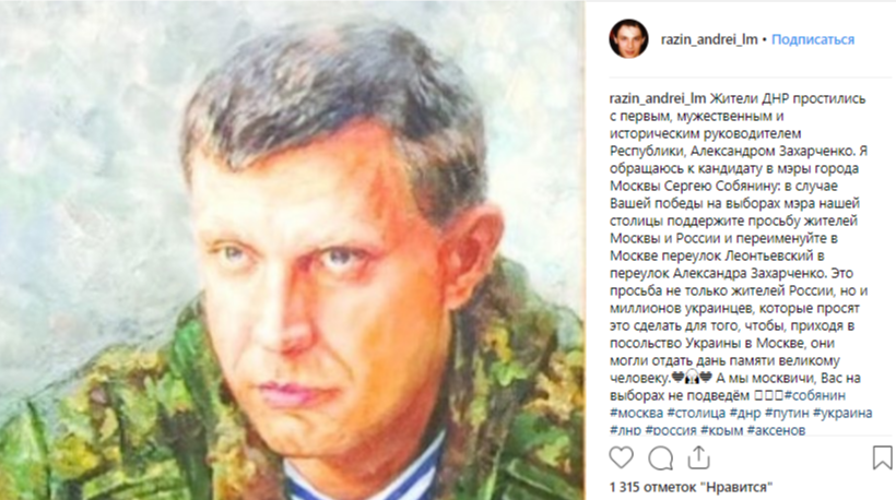 Известный продюсер группы "Ласковый май" Андрей Разин на своей страничке в Instagram обратился к мэру Москвы Сергею Собянину. Разин считает, что в случае победы Собянина на выборах мэра столицы в городе должен появиться переулок Александра Захарченко. В честь него он предлагает переименовать Леонтьевский переулок, на котором находится посольство Украины в России.
