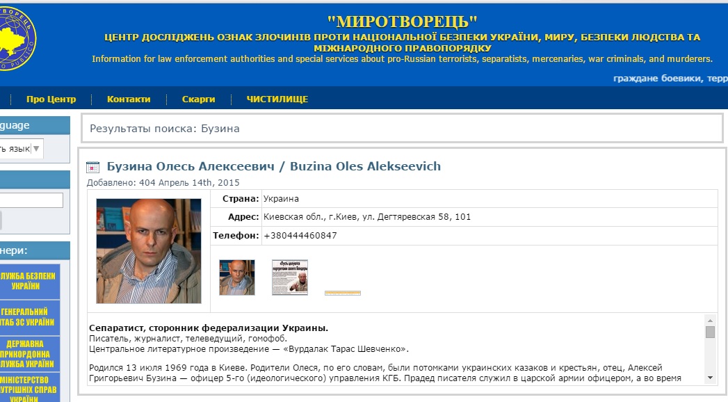 Позже все данные на Бузину исчезли с сайта. Зато на нем появился текст о том, что за писателем нет преступлений, которые бы позволили внести его на "Миротворец".