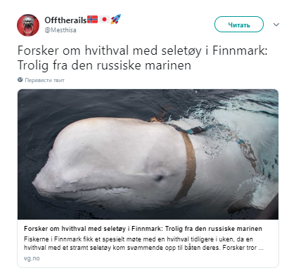 "Мы знаем, что в России держат прирученных китов, и что некоторые из них сбегают и следуют за нашими лодками", - сказал профессор Университета Тромсе Ойдин Рикардсен. Он добавил, что разговаривал с несколькими российскими учеными, и они сказали, что белуха могла принадлежать военной базе в Мурманске.