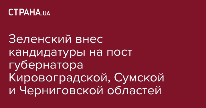 Президент Украины Владимир Зеленский подал кандидатуры на пост губернатора в Кировоградской, Сумской и Черниговской областях. Об этом в Facebook написал нардеп из фракции "Европейская солидарность" Алексей Гончаренко.