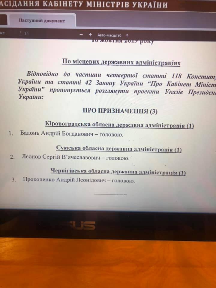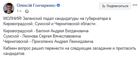 По его словам, кандидат на должность губернатора Кировоградской области - Андрей Богданович Балонь; Сумской - Сергей Вячеславович Леонов; Черниговской - Андрей Леонидович Прокопенко. Нардеп Гончаренко также отметил, что Кабмин решил перенести вопрос об их назначении на следующее заседание и пригласить кандидатов.