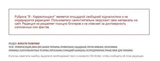 Редакция Корреспондент.net акцентирует внимание на том, что согласно украинского законодательства, именно автор статьи должен нести всю ответственность за свои публикации, в том числе и за достоверность опубликованной им информации. В то же время раздел "Я - корреспондент" является лишь платформой для размещения авторских материалов блогеров.