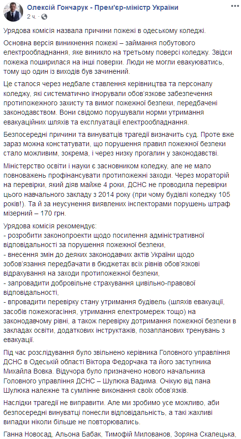 При этом Гончарук вступился за Министерство образования и науки. Чиновники, по его словам, не имели полномочий профинансировать противопожарные мероприятия из-за моратория на проверки, который действовал почти 4 года.
