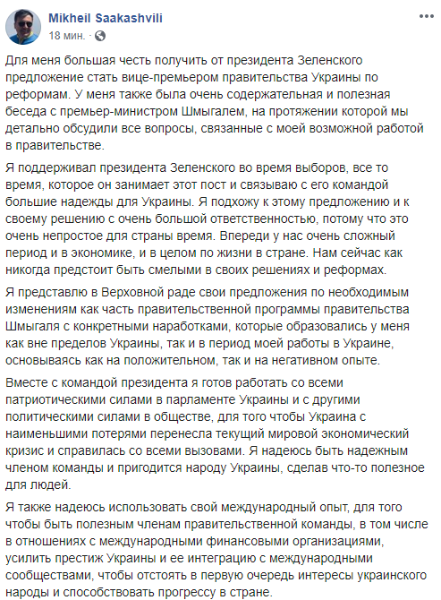 "Для меня большая честь получить от президента Зеленского предложение стать вице-премьером правительства Украины по реформам. У меня также была очень содержательная и полезная беседа с премьер-министром Шмыгалем, на протяжении которой мы детально обсудили все вопросы, связанные с моей возможной работой в правительстве", - написал Саакашвили.