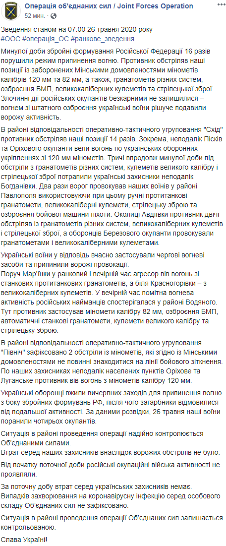 В течение понедельника, 25 мая, сепаратисты 16 раз нарушили режим прекращения огня на Донбассе, украинские военнослужащие не пострадали.