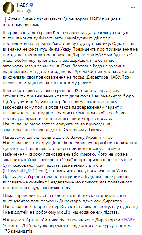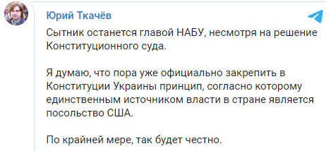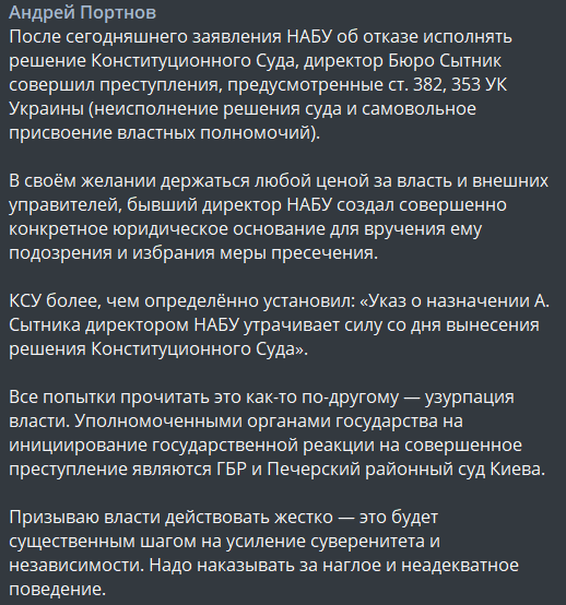 "После сегодняшнего заявления НАБУ об отказе исполнять решение Конституционного суда директор Бюро Сытник совершил преступления, предусмотренные ст. 382, 353 УК Украины (неисполнение решения суда и самовольное присвоение властных полномочий).