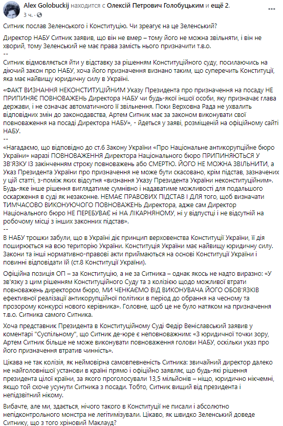 Извините, но мы, кажется, ничего такого в Конституции не писали и абсолютно неподконтрольного монстра не легитимизировали. Интересно, как быстро Зеленский докажет Сытнику, что из него хреновый Маклауд?", - пишет Голобуцкий.