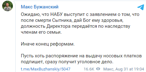 "Ожидаю, что НАБУ выступит с заявлением о том, что после смерти Сытника, дай Бог ему здоровья, должность Директора передаётся по наследству членам его семьи.