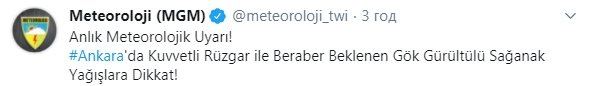 "Согласно данным с радаров, ожидаются сильные ливни и грозы в западной и северной частях Анкары (в районе городов Полатлы, Айас, Бейпазары, Гюдюль и Кызылджахамам) в течение следующих двух часов. Следует быть осторожными и готовыми к наводнениям, граду и сильному ветру", - говорится в заявлении ведомства.