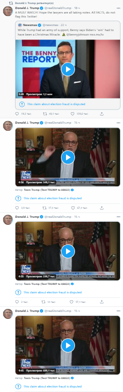 То есть уже из этой фразы видно, что с проигрышем этих выборов Трамп смирился и намерен готовиться к следующим. В его Твиттере происходят уже откровенно странные вещи - президент постит по пять видео подряд с передачами телеканала FoxNews. Причем некоторые из них - без малейших комментариев.