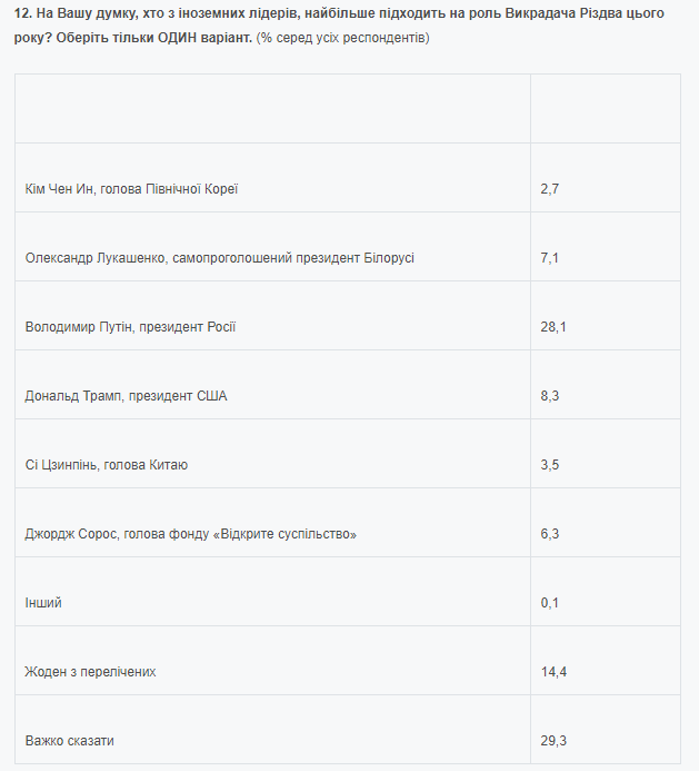 По мнению жителей Украины, среди иностранных лидеров роль "главного похитителя Рождества 2020 года" занял президент России Владимир Путин (28%). В два раза меньше опрашиваемых (14%) не смогли назвать на эту роль никого.