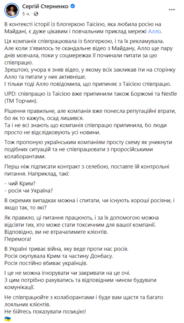 Стерненко воспринял расторжение сотрудничества "Алло" с Таисией, как свою личную победу. Он заявил, что с блогершей перестали работать и другие компании. И предложил им впредь спрашивать у сотрудников "Чей Крым".