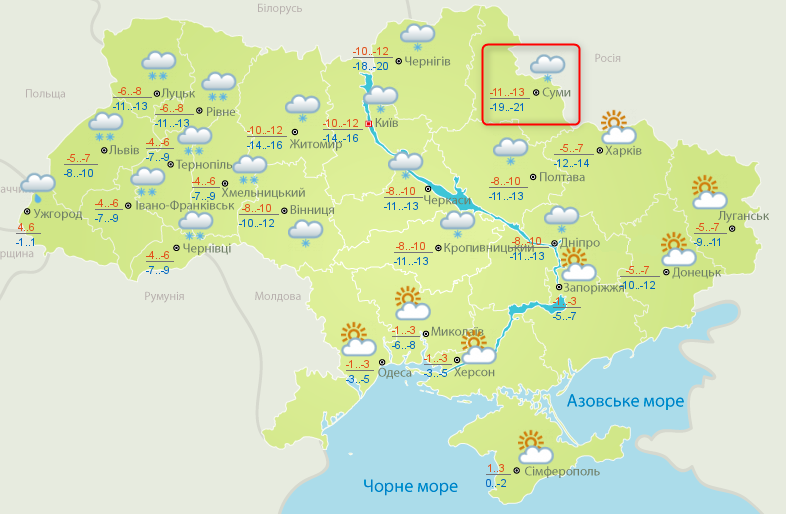 Впрочем, холоднее всего будет на этих выходных в Сумах. Там передают -11...-13 днем, а ночью до -21°.