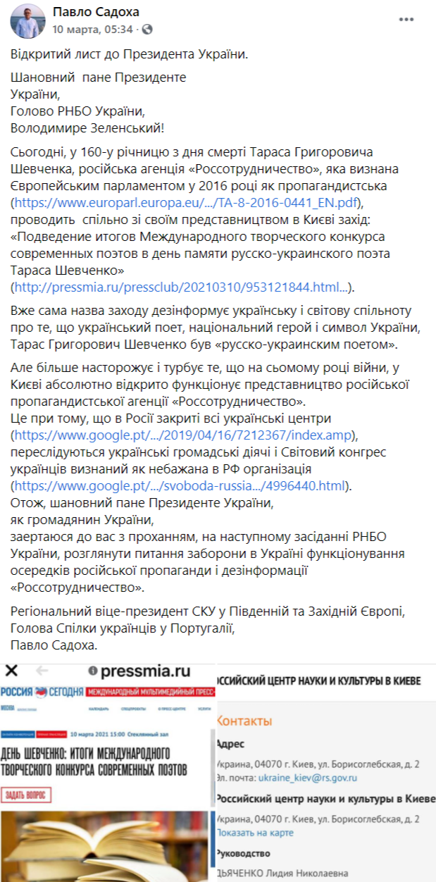 "Само название мероприятия дезинформирует украинское и мировое сообщество о том, что украинский поэт, национальный герой и символ Украины Тарас Григорьевич Шевченко был "русско-украинским поэтом". Но больше настораживает и беспокоит то, что на седьмом году войны в Киеве совершенно открыто функционирует представительство российского пропагандистского агентства Россотрудничество. Это при том, что в России закрыты все украинские центры, преследуются украинские общественные деятели и Всемирный конгресс украинцев признан как нежелательная в РФ организация", – подчеркнул Садоха 10 марта.