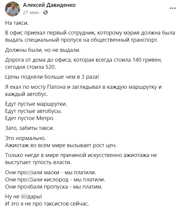09:37 Предприниматель Алексей Давиденко рассказал, как сотрудники его фирмы (аптечный бизнес), так и не получив спецпропуска от мэрии, вынуждены были добираться на работу на такси.