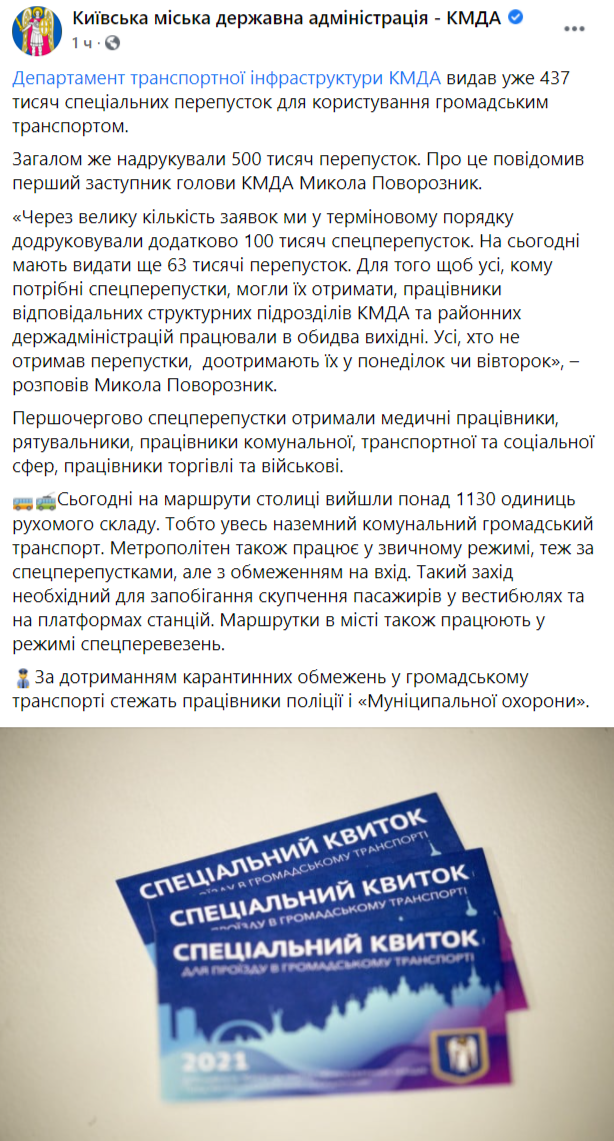 12:34 Департамент транспортной инфраструктуры КГГА выдал 437 тысяч спецпропусков для пользования общественным транспортом. Всего напечатали 500 тысяч пропусков. Об этом сообщил первый заместитель председателя КГГА Николай Поворозник.